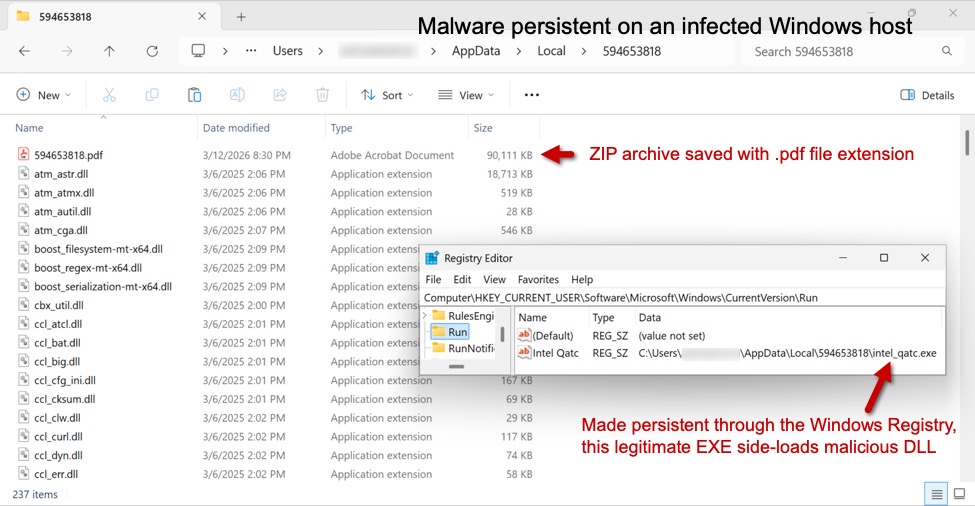 After running the ClickFix-style instructions, the malware was sent as a ZIP archive and saved to disk with a .pdf file extension. This appears to be Remcos RAT in a malicious package that uses DLL side-loading to run the malware. This infection was made persistent with an update to the Windows Registry.