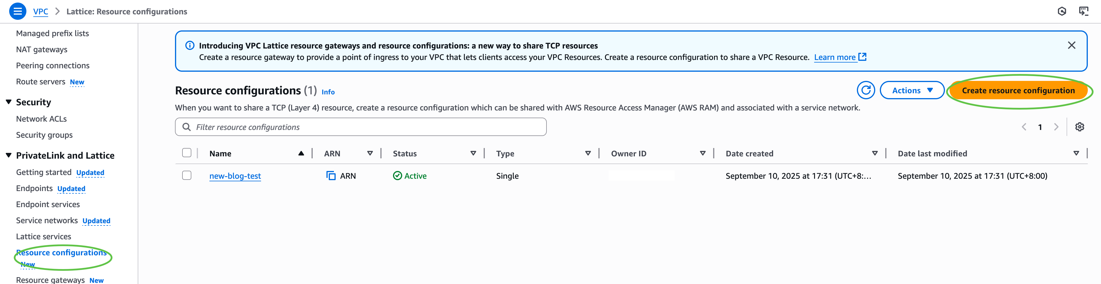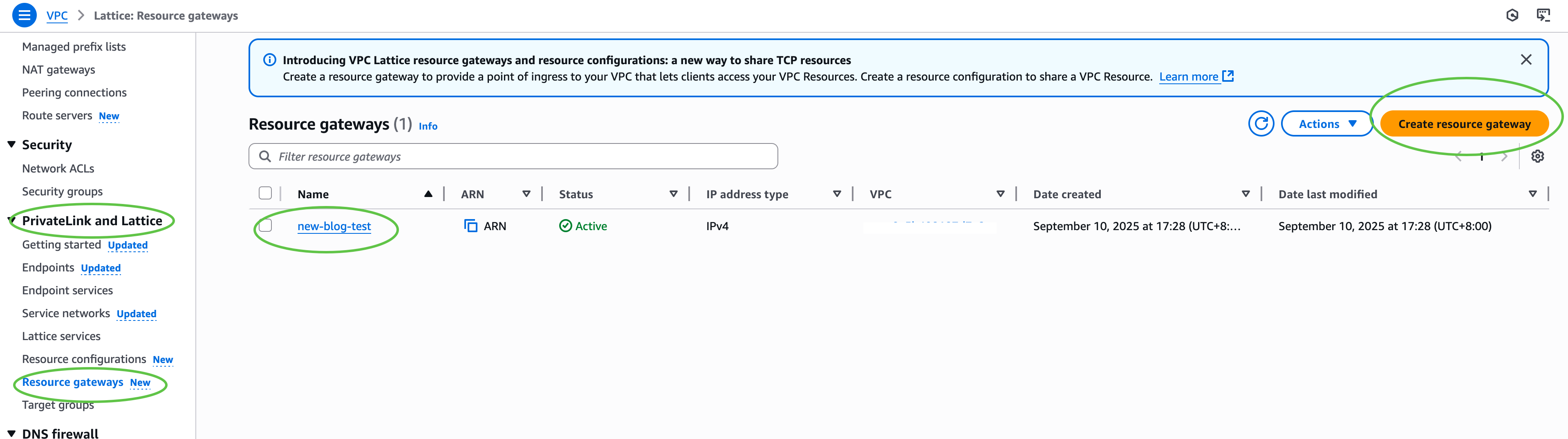First, I configure my VPC Lattice resources. In the Amazon VPC console, under PrivateLink and Lattice in the navigation pane, I choose Resource gateways, choose Create resource gateway to create one to act as the ingress point into my VPC. Next, under PrivateLink and Lattice in the navigation pane, I choose Resource configuration and choose Create resource configuration to create a resource configuration for my target SFTP server. Specify the private IP address or public DNS name, and the port (typically 22).