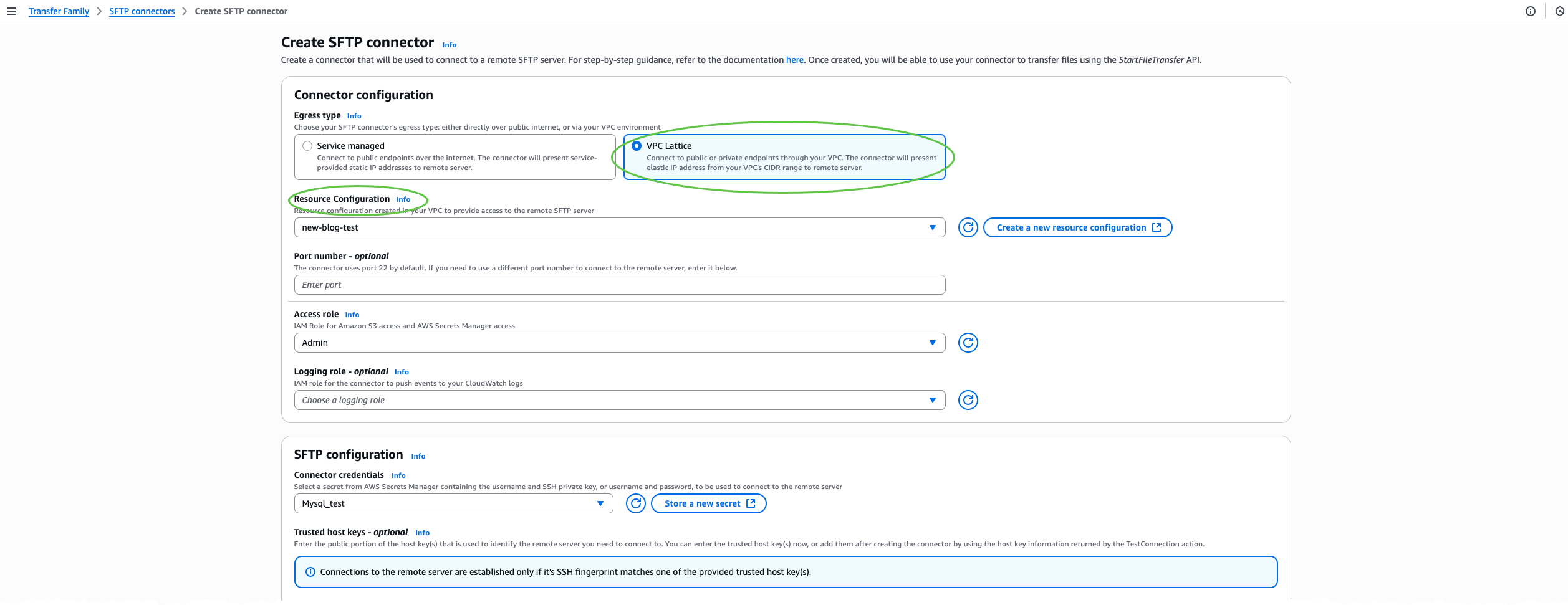 After that, I create an SFTP connector through the AWS Transfer Family console. I choose SFTP Connectors and then choose Create SFTP connector. In the Connector configuration section, I select VPC Lattice as the egress type, then provide the Amazon Resource Name (ARN) of the Resource Configuration, Access role, and Connector credentials. Optionally, include a trusted host key for enhanced security, or override the default port if my SFTP server uses a nonstandard port.