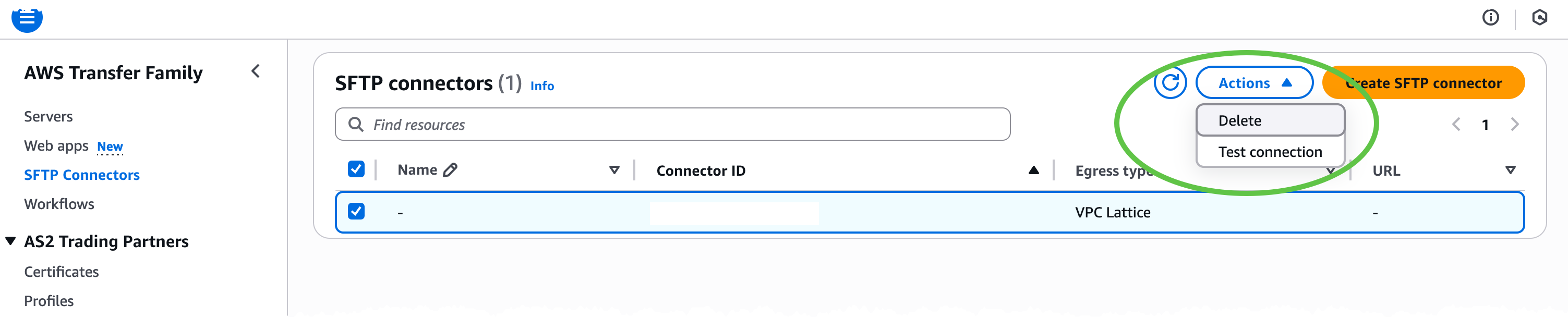 Next, I test the connection. On the Actions menu, I choose Test connection to confirm that the connector can reach the target SFTP server.