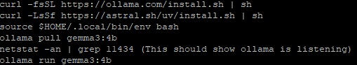 I used these steps to get Gemma setup. First review the requirements for RAM [3] before deciding with Gemma 3 model to install. You can start small (i.e. 4B or smaller) for testing before using a larger model. I'm using 4B and 12B with 16 GB of RAM with my installation.