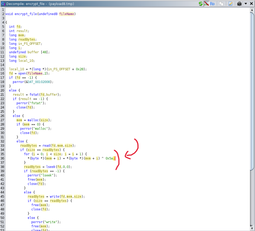 The Base64 payload is not very interesting, it's an ELF file (SHA256:52fc723f7e0c4202c97ac5bc2add2d1d3daa5c3f84f3d459a6a005a3ae380119) that will just encrypt files using a 1-byte XOR key:
